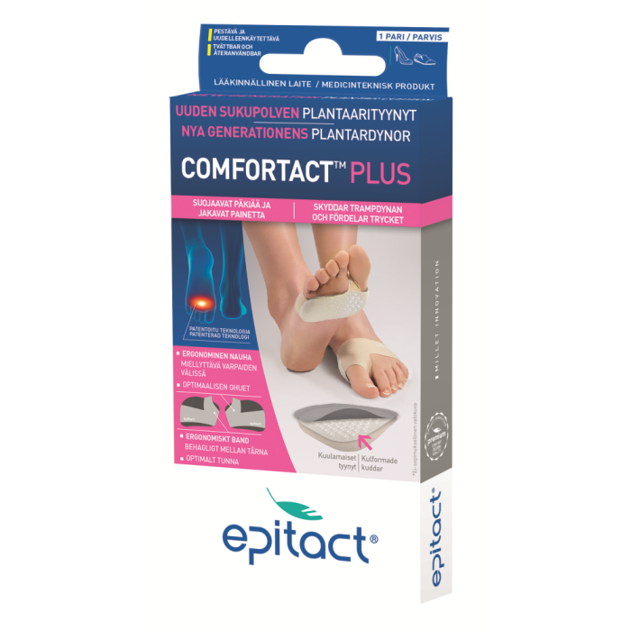 - EPITHELIUM 26® -silikonigeelistä valmistettu osa tuntuu kuin kuulilta. Se on kehitetty muotoutumaan miellyttävästi päkiän ympärille ja jakamaan painetta.